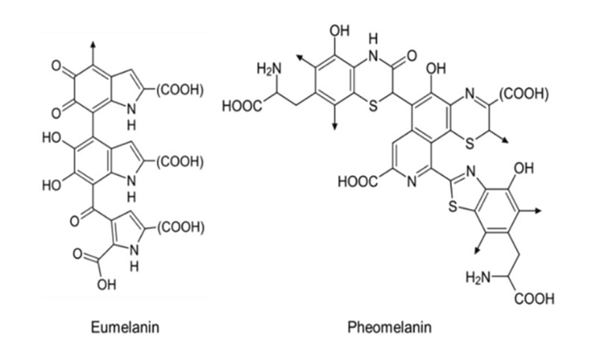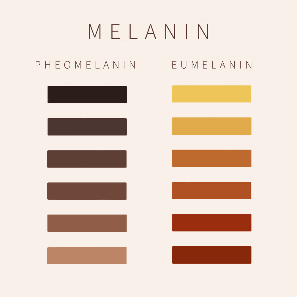 가장 기본색이라 할 수 있는 흑발의 경우엔 Eumelanin이, 금발의 경우엔 Pheomelanin이 존재하며 이들의 함량에 따라 다양한 색상의 머리색이 나오게 됩니다.